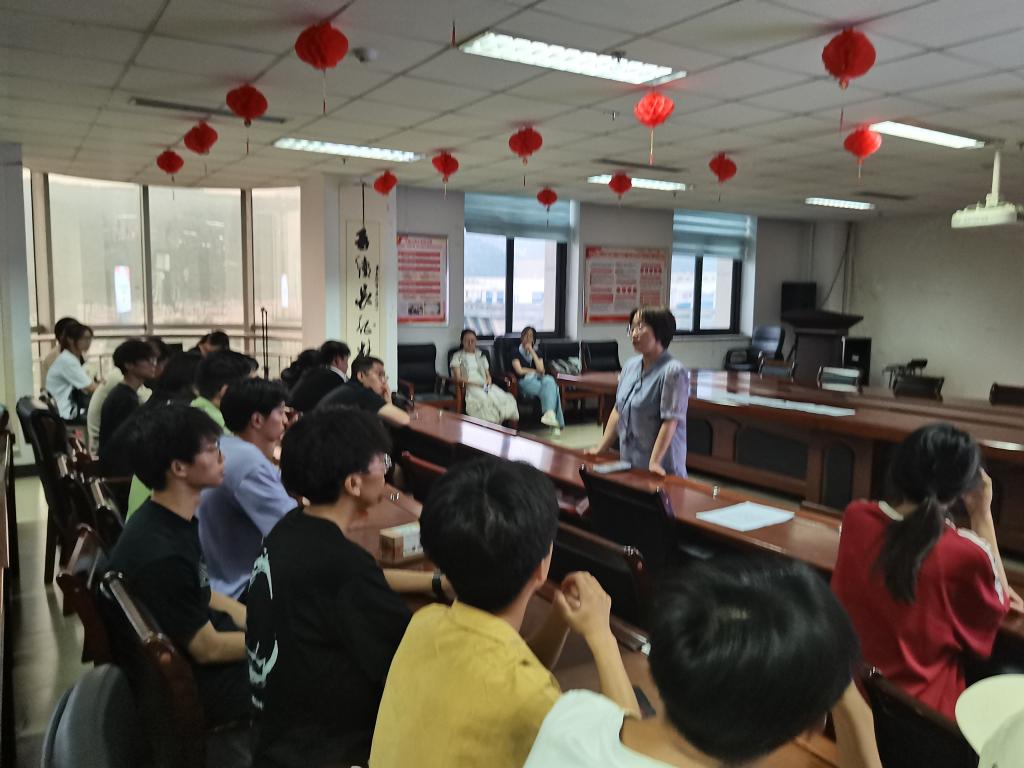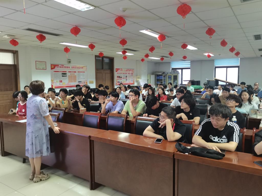 党委副书记魏春燕老师主讲,辅导员潘昊嵩参会,全体暑期留宿本科生到场学习。