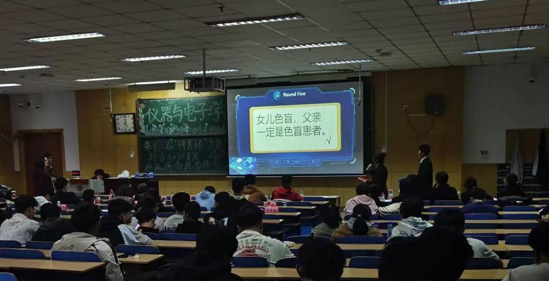 先是四支队伍分别上台自我介绍,之后设置了小试牛刀,火眼金睛,知识探险,先声夺人四轮闯关,比赛现场气氛活跃,选手的每一次抢答得分都紧扣着同学们的心弦,比赛间隙进行了微信抽奖游戏,并为同学发放精致的小奖品,同时穿插着表演节目,为比赛增添了别样的乐趣,给同学们带来了一场与众不同的比赛。