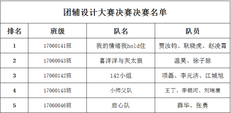 上午九点,比赛正式开始,进入决赛的队伍按照之前抽签顺序依次上台答辩。每组队伍答辩后王蕾老师进行提问,并指出团辅中的需要改进之处。决赛现场异常激烈,经过参赛者精彩的答辩和老师犀利的提问,最后结果如下: