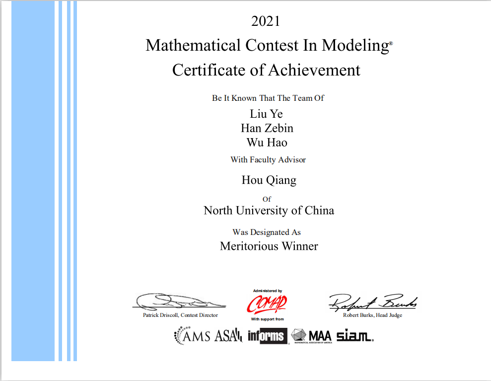 ● 2021年美国数学建模大赛 优异奖(M)