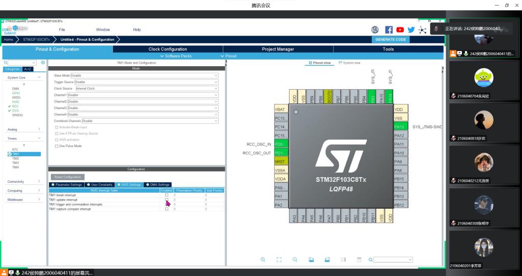 本次会议首先侯帅鹏学长简要介绍了比赛时间、规则等基本事项;其次,对“智能防疫门闸”比赛题目进行相关介绍,从基本功能要求到可自选功能开发,依次讲解所需材料,相应设施。然后大家就目前技术掌握程度进行汇报,说明自身情况。对于技术方面,侯帅鹏学长结合大家目前能力,简要分析情况,督促大家设立目标,合理划分接下来的时间,好好学习相关技术。最后,对STM32cube mx untitled软件进行介绍,让大部分同学初步了解到软件构造和基础使用方法,为今后深入使用相关软件做出铺垫。同时,询问各成员最近其他技术学习情况,对于有问题同学给予指导。