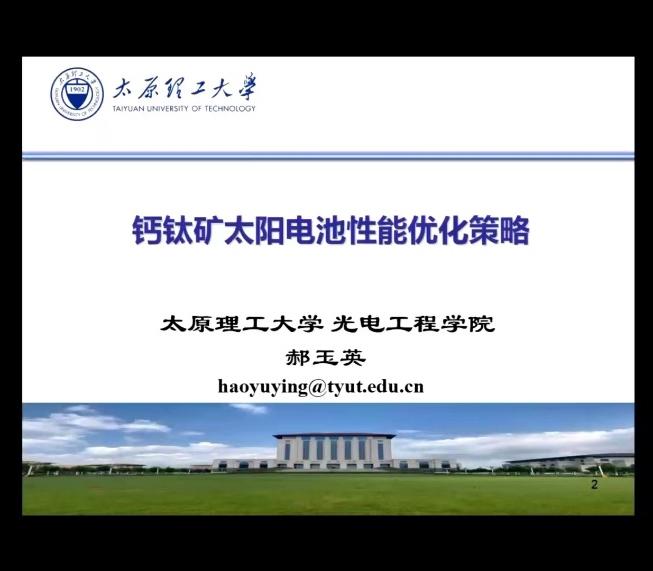 郝玉英,太原理工大学教授,博士生导师。入选山西省学术技术带头人、山西省“333”科学技术人才、山西省教学名师、“三晋英才”拔尖骨干人才。“有机光电转化材料与器件”山西省科技创新团队带头人。兼任中国物理教育学会理事,山西省物理学会常务理事,山西省光学学会理事。获山西省科学技术奖技术发明类二等奖1项,山西省科学技术奖自然科学类二等奖2项。讲座从卤化物钙钛矿材料因其高的光吸收系数、合适的禁带宽度、优良的双极性传输特性以及简单的制备工艺等优势出发,介绍了钙钛矿太阳电池面临着如大面积钙钛矿薄膜的可控制备、界面缺陷的精准钝化、界面能级调控、电池的稳定性等挑战。