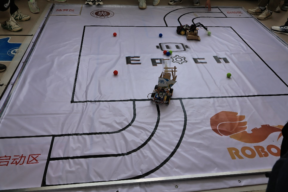 校内赛的主题是“二龙戏珠”,比赛规则为1v1对抗,双方需要争夺赛场上的9颗海绵小球,并放置在己方的结算区域内。每支参赛队由2名同学组成,参赛者需要综合运用机械、电子、控制、计算机等技术知识和手段,经过一个多月制作和准备,利用机器人完成遥控移动、拾取小球、放置小球等功能。
