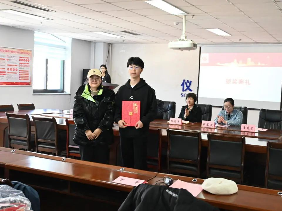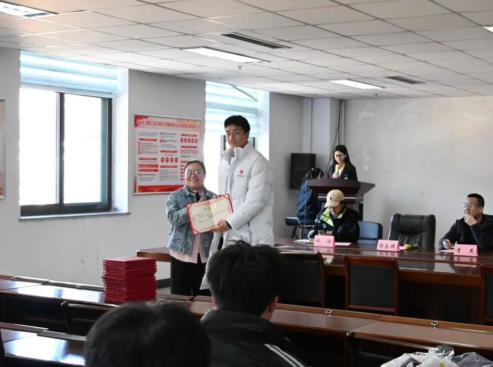 辅导员姚瑶和科研科武宏波两位老师为篮球赛获奖班级及优秀裁判颁奖。
