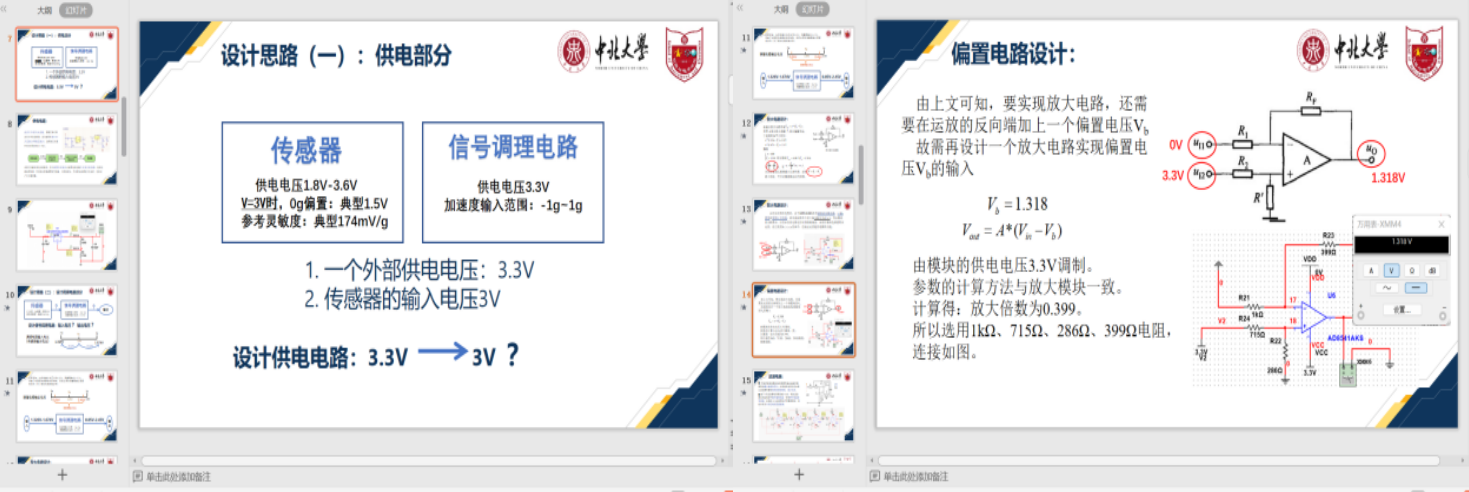 通过完成设计阶段的实训任务,同学们对加速度传感器的背景及应用都有了较为深刻的理解,同时每组同学都成功独立完成方案设计并建模仿真了各单元电路的可行性,加深了同学们对理论知识的理解,大大提高了同学们对之后进一步进行实物焊接测试标定的兴趣。
