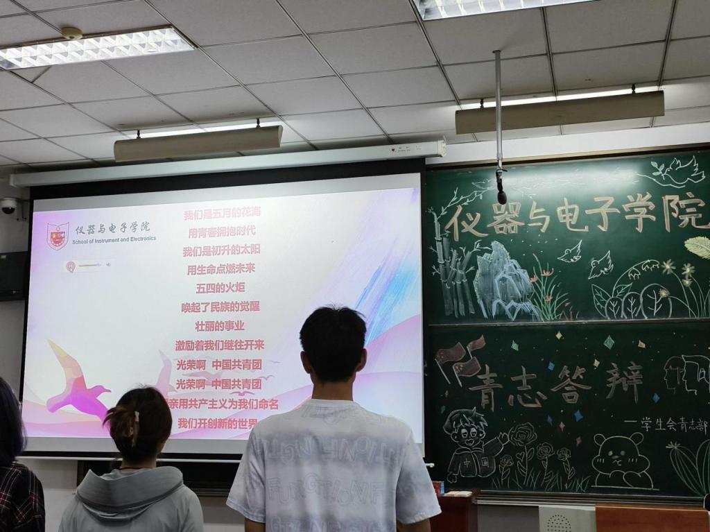 的青志部长,担任本次答辩的评委。答辩开始,全体同学起立共唱中国共产主义青年团团歌《光荣啊,中国共青团》。随后,两位主持人向各位评委详细阐释了本次答辩的评分标准。本答辩活动正式开始,九位答辩人依照顺序,轮番上台答辩。答辩结束后,经过工作人员核分,为获奖的班级颁奖。其中,2023级242班荣获一等奖,142班,143班荣获二等奖,441班,144班,243班荣获三等奖。