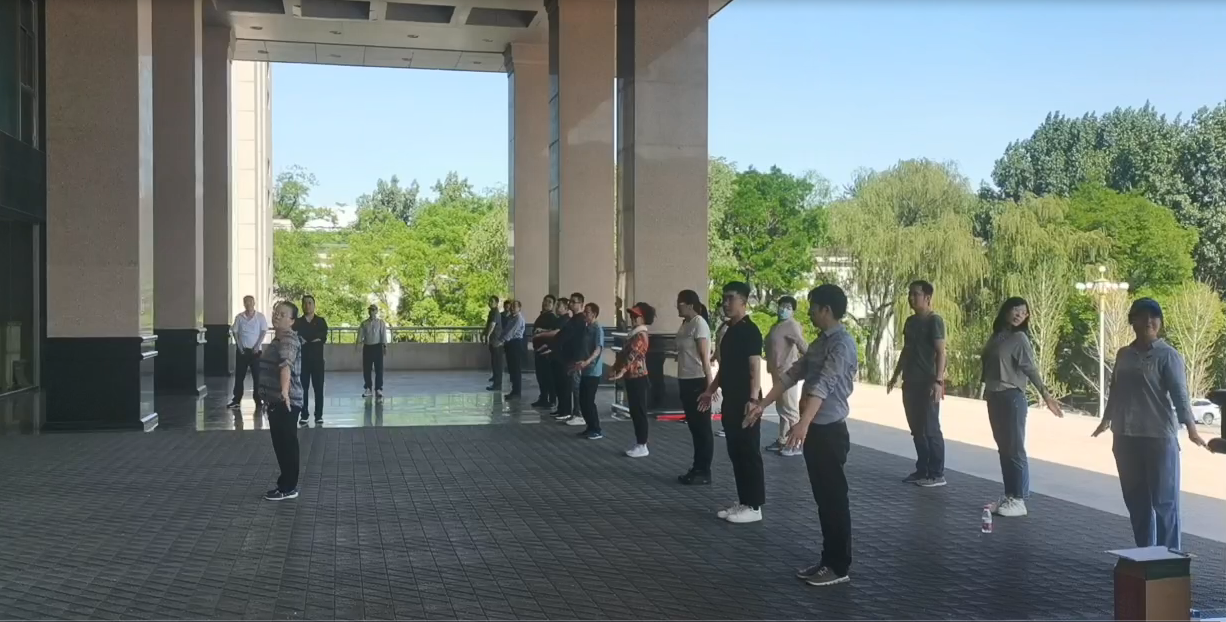 教工们或聚集到11号楼二层平台,或因地制宜,在各自的办公室开展工间操活动。练习工间操的活动吸引了越来越多的教师们参加。