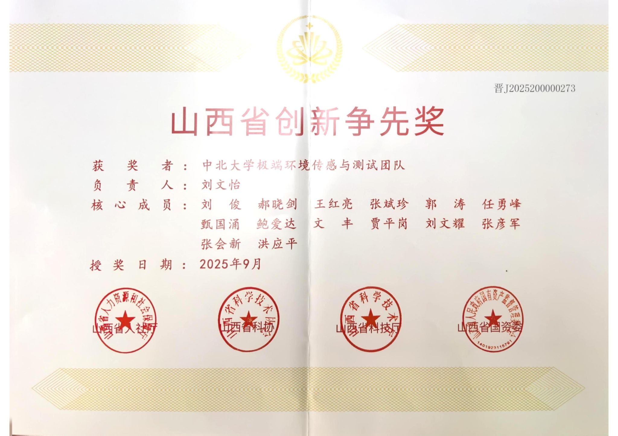 极端环境传感与测试团队荣获“山西省创新争先奖”。