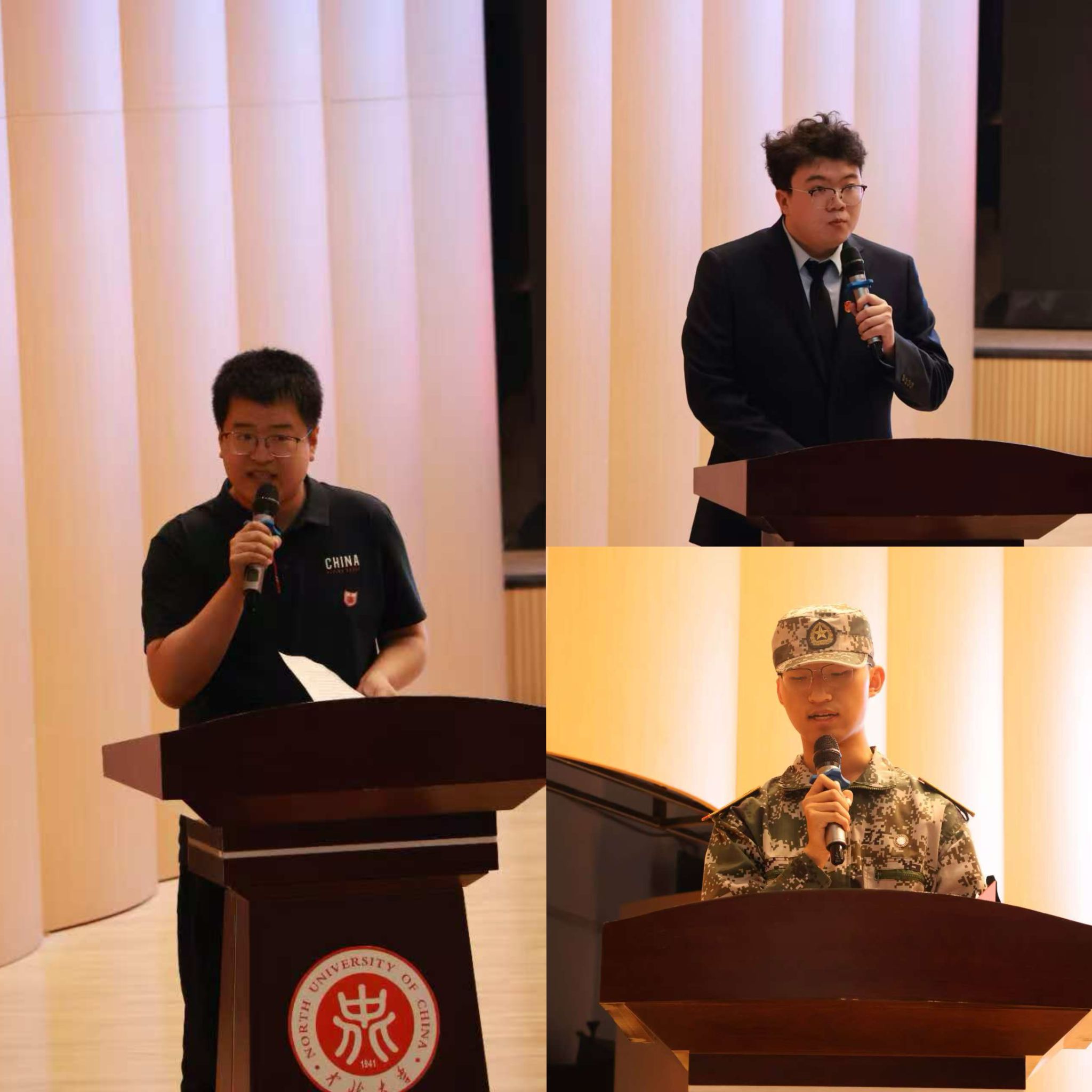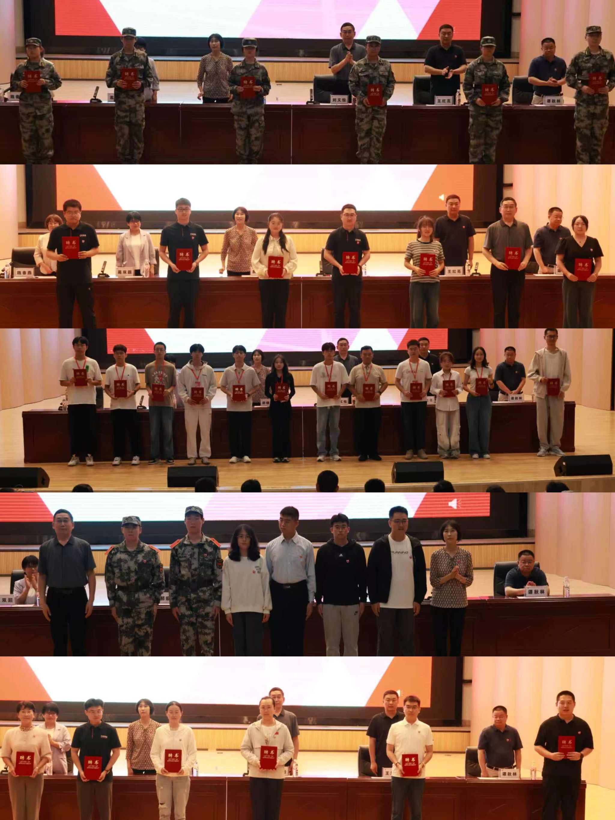 领导分别宣读2025级新生班主任聘任决定、新生朋辈导师聘任决定、军训教官聘任决定并颁发聘书。新生班主任代表、在校生代表、新生代表依次上台发言。