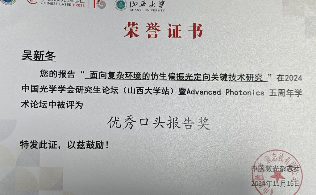 吴新冬同学积极参加各类学术交流活动,在2024中国光学学会研究生论坛中以《面向复杂环境的仿生偏振光定向关键技术研究》为主题进行了口头汇报,分享了团队在仿生偏振光导航领域的最新研究成果,并获得了中国光学学会研究生论坛优秀口头报告奖。