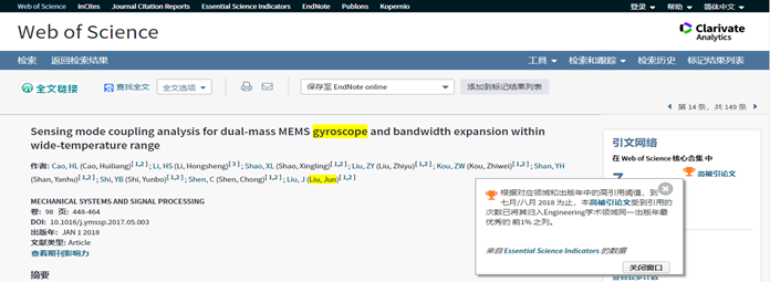 20181127ESI最新数据显示,由澳门太阳城刘俊教授领衔的抗高过载微机械陀螺仪方向的研究论文《Sensing mode coupling analysis for dual-mass MEMS gyroscope and bandwidth expansion within wide-temperature range》入选工程学领域ESI高被引论文。该论文以青年教师曹慧亮副教授为第一作者(刘俊教授为通信作者)发表于《MECHANICAL SYSTEMS AND SIGNAL PROCESSING》期刊(工程:机械领域一区,TOP期刊,2017年影响因子4.37)上,重点解决了微机械陀螺仪机械灵敏度和带宽之间相互矛盾的问题,为高精度、宽带宽微机械陀螺仪的进一步工程应用提供了支持。