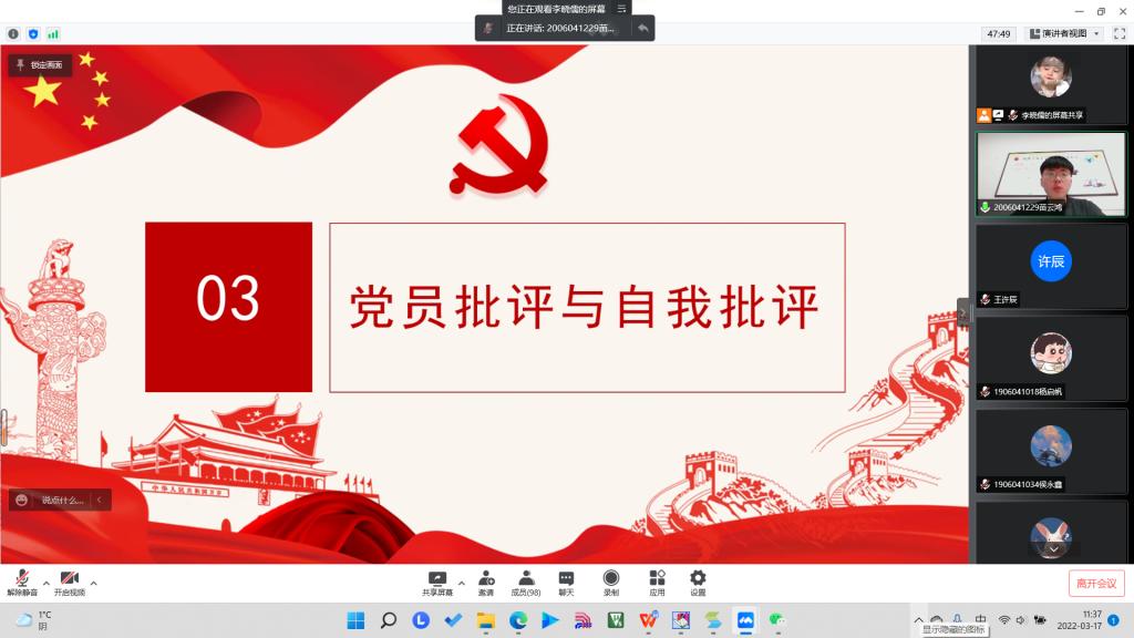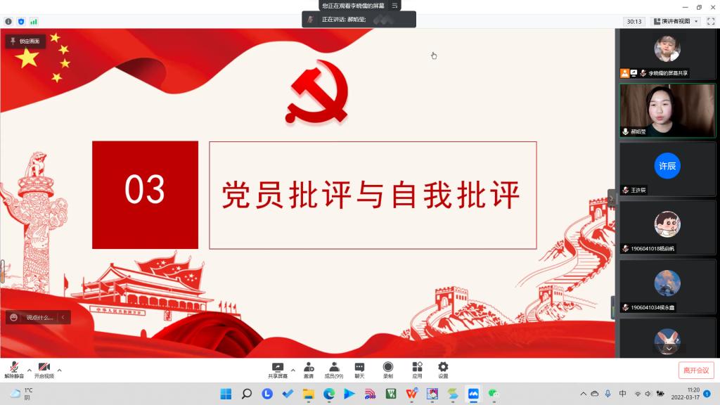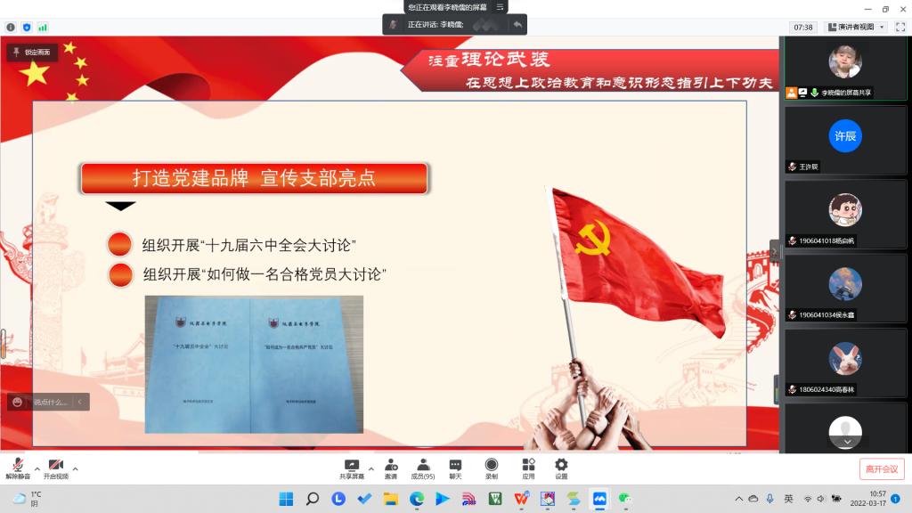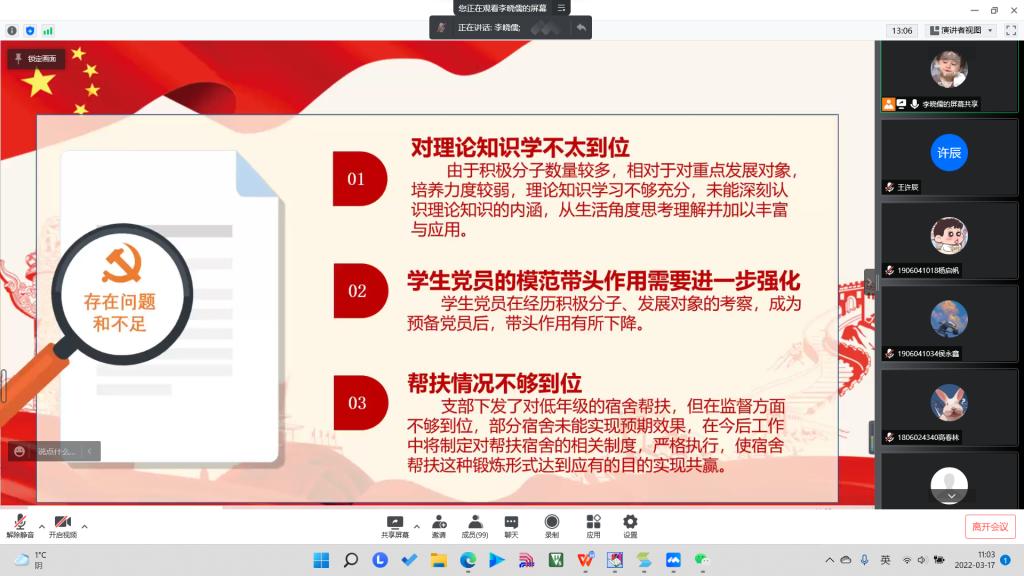 会议第一项,党支部书记荆伟伟向出席的全体同志汇报支部2021年度工作建设情况、党员发展情况、支部开展党史等理论学习活动情况。总结支部在2021年度的党员发展工作情况,并且针对于更多人数的党员队伍提出要做好自身管理与支部管理。总结开展的党日活动、实施助班党员以及宿舍帮扶制度,有效发现身边群众的困难,为群众提供及时帮助。并提出新的一年要打造党建品牌,宣传支部亮点,安排了党员人人做宣讲的工作。同时荆伟伟书记指出了自身的不足,以及党支部党员帮扶工作不实不够问题,带头进行自我批评,提出整改措施,对支部发展提出新期望。