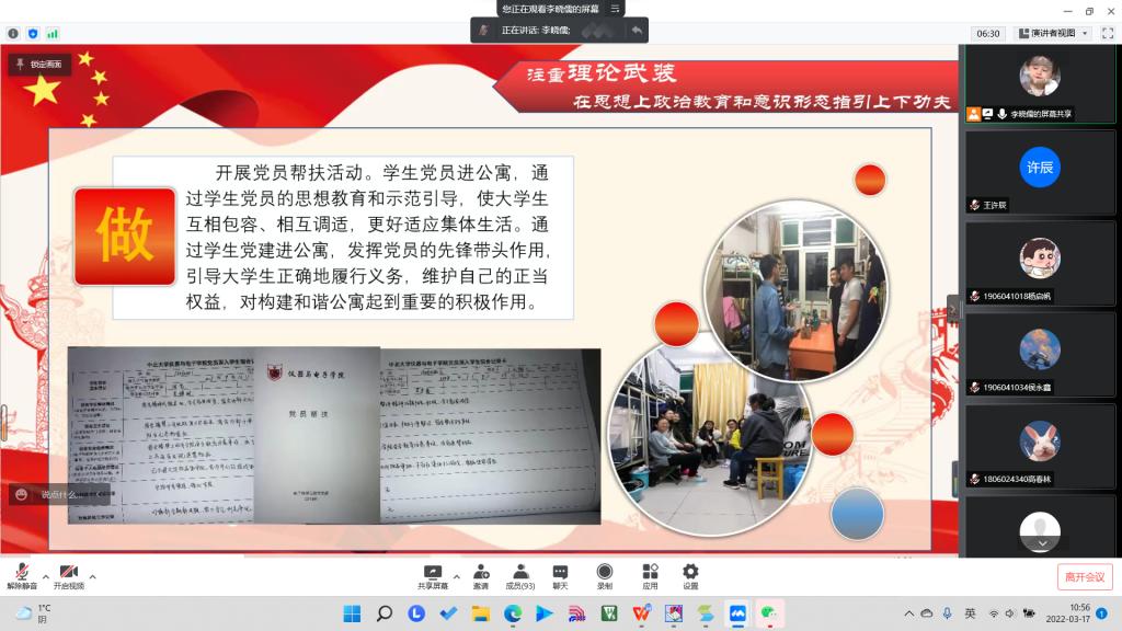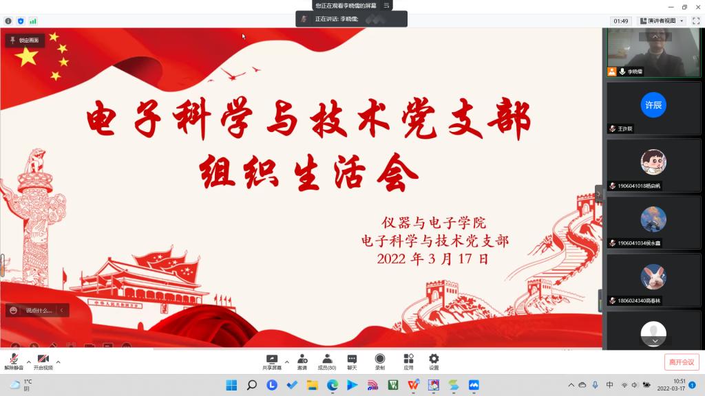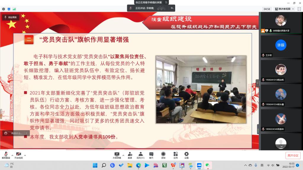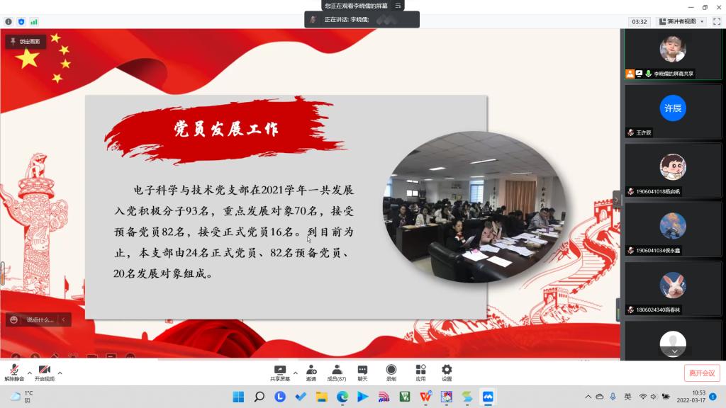 院党委副书记杜瑞平、电子科学与技术党支部书记荆伟伟,以及电子科学与技术党支部正式党员24人,预备党员82人参加此次线上会议。