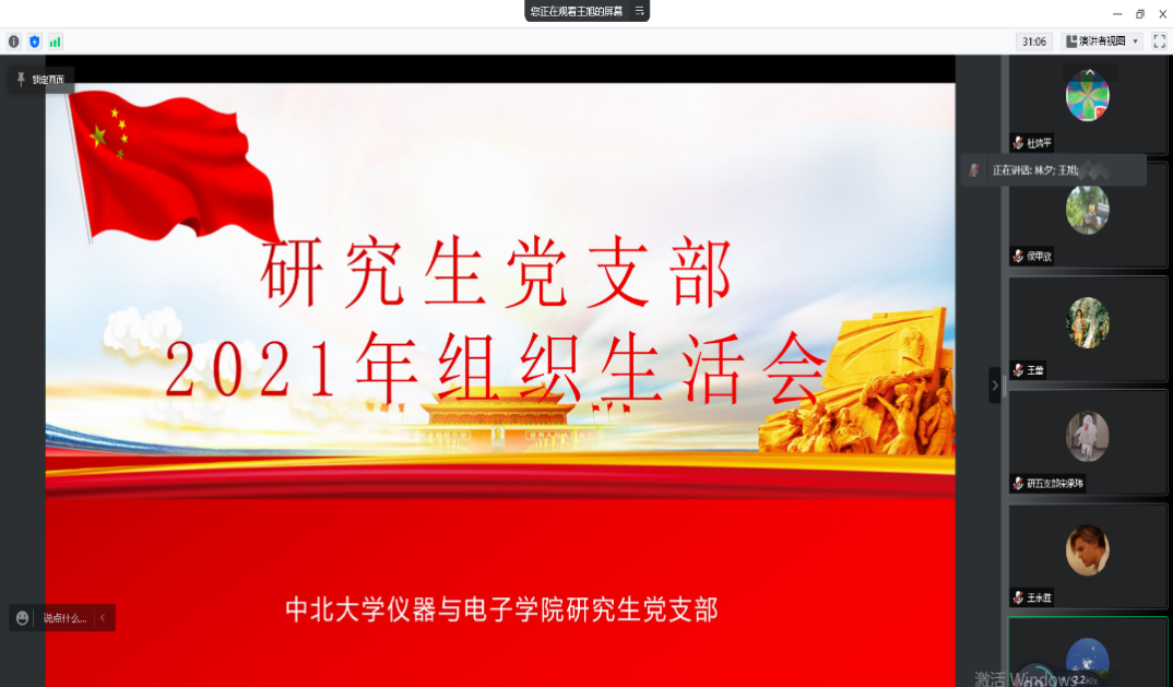 大会总共分为三部分:第一:以党小组会形式开展党员自评何互评;进行民主测评;第二:召开支部大会,党小组代表发言,支部书记进行总结;第三:支委向上级领导进行总结汇报,接受指导。会上,第一党小组蔡麒和王采慧代表党小组发言;第二党小组杨振泽和薛思琪代表党小组发言;第三党小组裴攀 和宋承玮代表党小组发言;第四党小组贾涛和孙华荣代表党小组发言;第五党小组贾莉和贾旭光代表党小组发言。他们对自己一年来的生活和工作进行了总结,指出自己的不足,并对这些不足给出了解决的方法和措施。最后党小组以线上匿名投票的形式进行了民主自评,结果为24个党员被评为优秀,其余党员均合格。最后支部书记王佳进行总结。