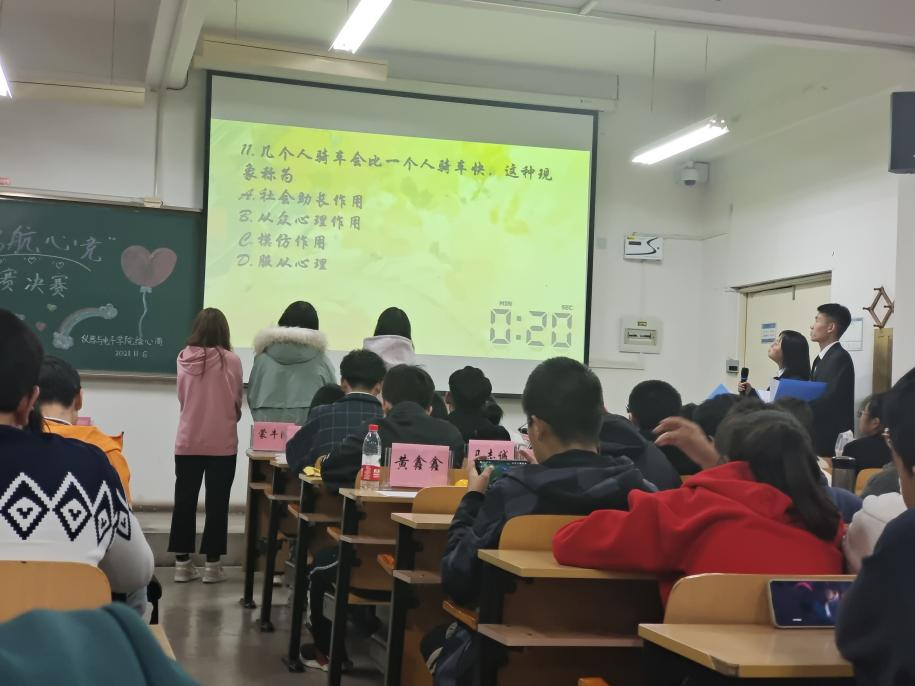 经过10月30日举办的初赛的选拔,六支队伍脱颖而出进入到了本次决赛。赛前,六支队伍积极准备,展现出了极好的竞技状态。本次决赛分为“孤岛初相连”、“心海共泛舟”、“心灵独问答”、“心理面对面”四个环节。经过紧张激烈的比拼,最终决出本次决赛的前三名。在每个环节间隙均穿插抽奖、小游戏等活动活跃比赛气氛。