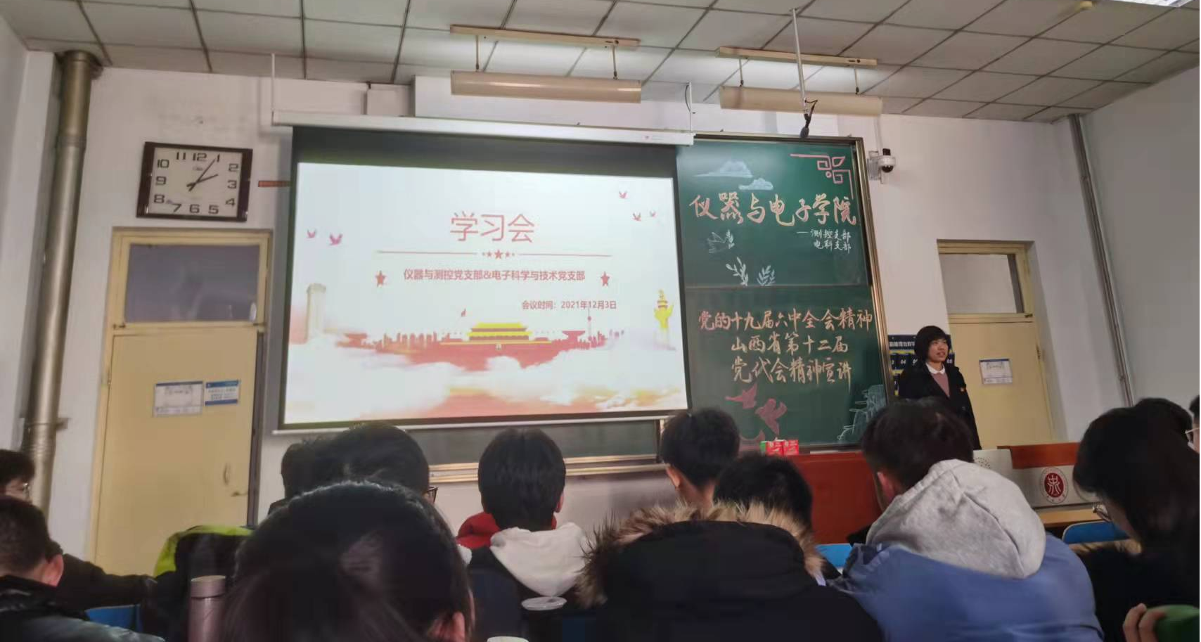 2021年12月3日,仪器与测控党支部与电子科学与技术党支部于11306H召开“党的十九届六中全会精神及山西省第十二届党代会精神”宣讲会,宣讲人为澳门太阳城